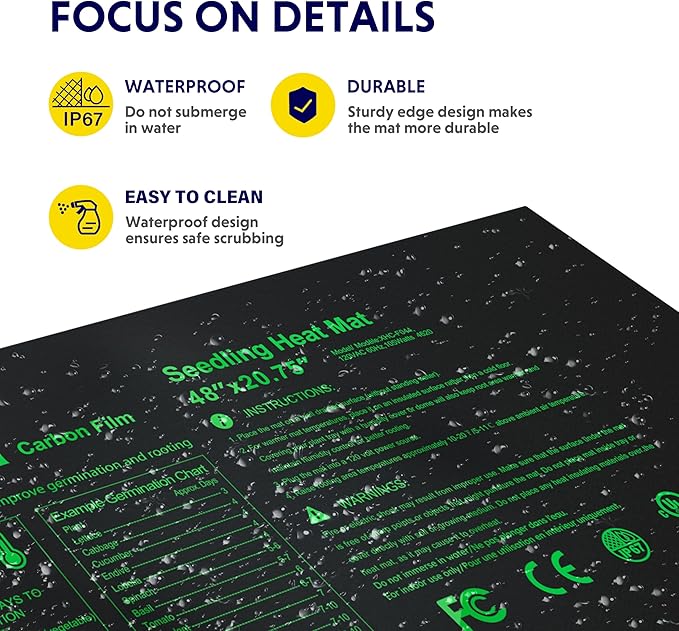 - Energy saving: with upgraded size 48 X 20.75-inch, the heat mat helps you save on electricity while running on only 20W power. You can also easily plug the 5.9 feet Power cord into the sockets you need.