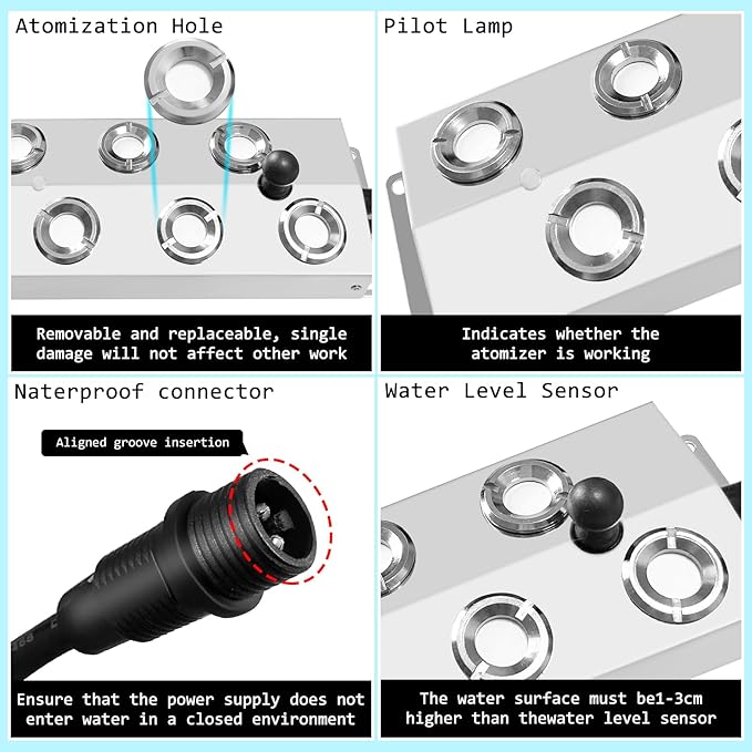 - 【Buoy and Protection Features】The included buoys help maintain proper water levels, while the mist maker is equipped with water shortage and high-temperature protection functions, If the water surface is below the water level sensor or the temperature is above 55℃ (the working water temperature range: 5℃-55℃), the power will be automatically shut down