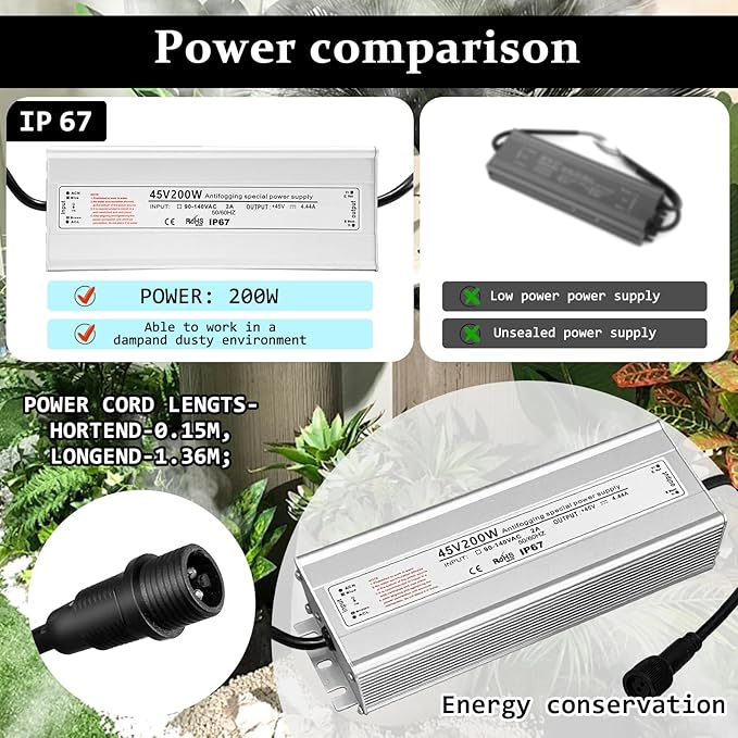- 【Professional Grade】Constructed with food-grade 304 stainless steel, this fog maker is designed for durability and is IP67 waterproof, ensuring reliable performance in damp and dusty environments. Please do not put the power supply directly in the water. The 5m power adapter cable is long enough for various applications.