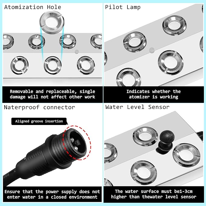 - 【Buoy and Protection Features】The included buoys help maintain proper water levels, while the mist maker is equipped with water shortage and high-temperature protection functions, If the water surface is below the water level sensor or the temperature is above 55℃ (the working water temperature range: 5℃-55℃), the power will be automatically shut down