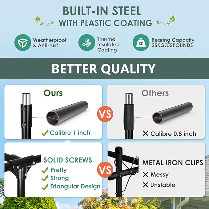 - Premium Material -- The garden trellis is made of excellent materials, and sturdy built-in steel with plastic coating. The durable frame is weatherproof, providing strong support for your climbing plants and keeping a good condition even in long time damp and humid conditions.
