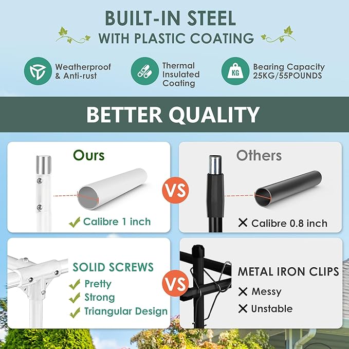 - Premium Material -- The garden trellis is made of excellent materials, and sturdy built-in steel with plastic coating. The durable frame is weatherproof, providing strong support for your climbing plants and keeping a good condition even in long time damp and humid conditions.