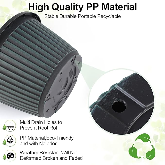 - 【Perfect Size & Sturdy Material】Top diameter: 10 inch, bottom diameter: 6.57 inch, height: 6.4 inch, capacity: 1.34 gallon. Plastic plant pots are made of recyclable polypropylene resin which is lightweight but sturdy, not easy crack. These indoor outdoor planters are UV and weather resistant. 10 inch flower pot is perfect for planting medium to large sized plants.