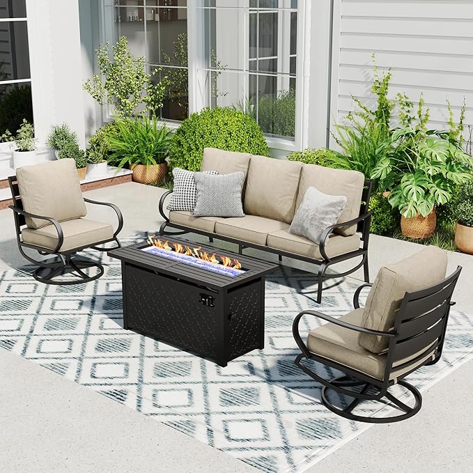 Sophia & William Patio Furniture Sets with 45" Gas Fire Pit Table Outdoor Metal Conversation Sets for 5, 2 x Swivel Cushioned Patio Sofa Chairs, 1 x 3-Seat Sofa 4 Pieces for Lawn Backyard Beige