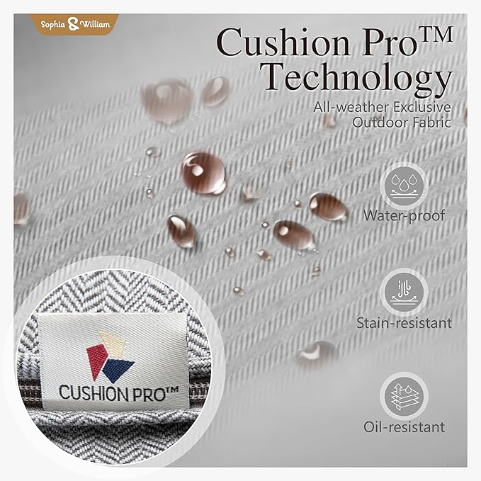 - Cushion-Pro Technology: Experience effortless maintenance with the Sophia & William conversation set. Crafted with premium olefin, our Patent Cushion Pro outdoor fabric boasts exceptional water-repellent, soil-release, and stain-resistant properties. Simply use a cleaning spray and watch the stains vanish, leaving your furniture looking as good as new