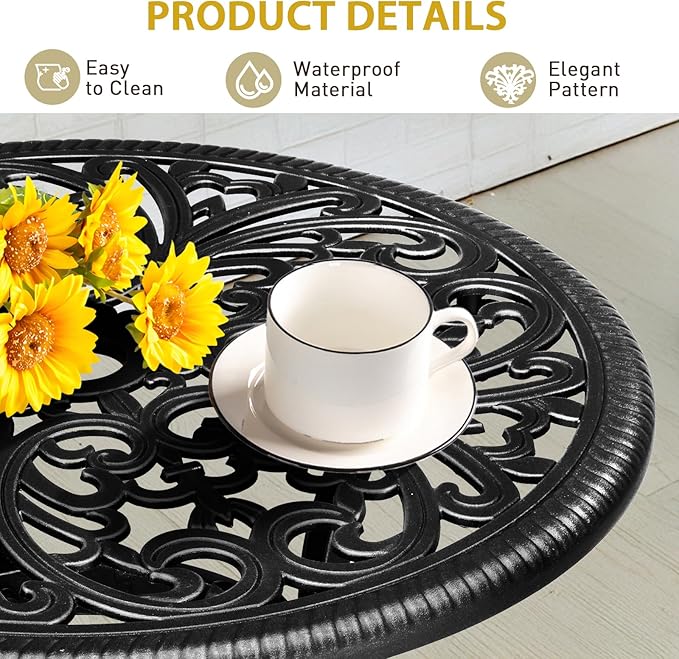 - PREMIUM CAST ALUMINUM: Crafted from high-quality cast aluminum, this round bistro table is built to withstand the elements. With exceptional durability, weather resistance and rust-proof features, it ensures long-lasting outdoor enjoyment with minimal maintenance required