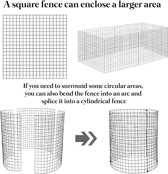 - DIY Plant Cage In Various Shapes: You can assemble 4 mesh into a square assembled plant cage, or assemble a round protection cage, or even more mesh into a larger plant wire cage to protect your plants from harm, use the wire ties included in the package to tie up, circle the plant and then fix it with metal stakes, very simple to install and easy to use.