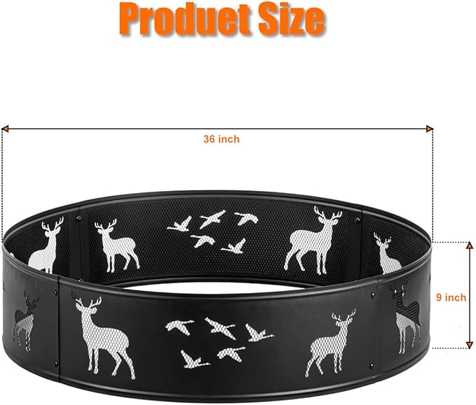 - [Practical & Beautiful Design]: The fire ring has mesh design allows for durability and good airflow for a bonfire. Itโs also avoids sparks and embers from flying out. Cute deer and bird cut-out in the fire ring, which enhance for style. The cutouts in fire ring look amazing when illuminated during an evening bonfire. Enjoy hours sitting around this outside fire ring with family and friends (Note: There is no bottom to this ring).