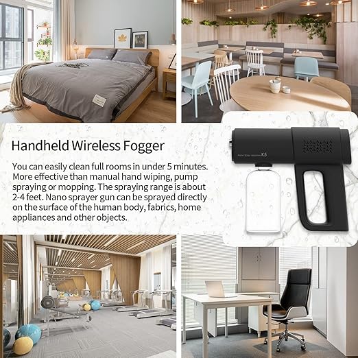 - 【Handheld Fogger】You can easily clean full rooms in under 5 minutes. More effective than manual hand wiping, pump spraying or mopping. The spraying range is about 2-4 feet. Fine particle sprayer gun can be sprayed directly on the surface of the human body, fabrics, home appliances and other objects.