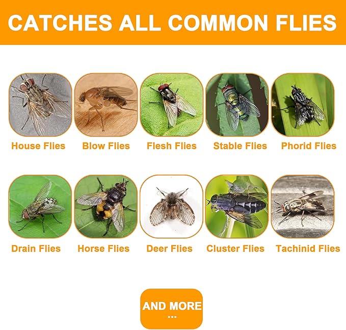 - PERFECT FLY REPELLENT: This fly trap attracts and kills a variety of common flies, including house fly, mosquito fly, blow fly, stable fly, phorid fly, gnats and so on, to drastically reduce fly populations around your home. Also keep your outdoor space free of nuisance flies. Perfect fly catchers for outdoor.