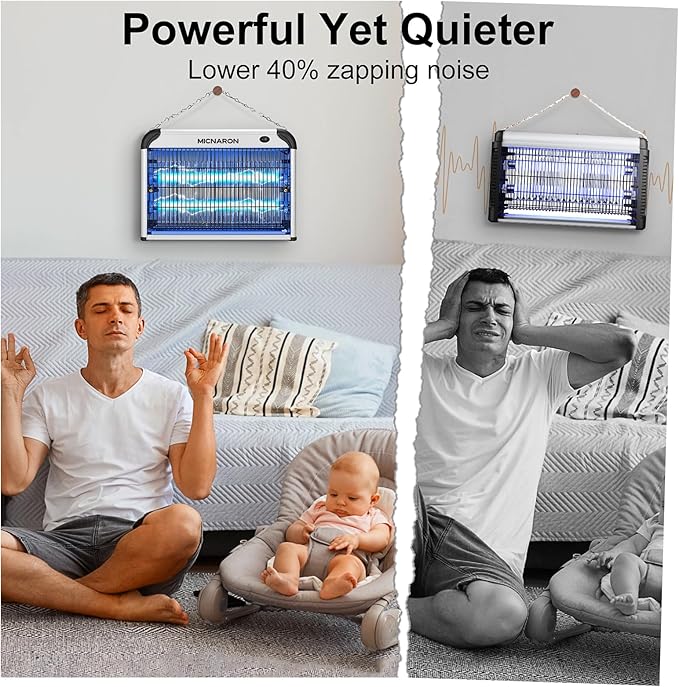 - π¬ππππππππ πππ πΌππππ-πΈππππ π΄πππππππ π²πππππ: This indoor bug zapper utilizes 2 10-watt ultraviolet bulbs to attract and instantly electrocute mosquitoes, gnats, moths, and other flying insects. Operating at 40% reduced noise compared to traditional zappers, it provides a highly efficient, ultra-quiet solution for eliminating all kinds of flying nuisances from your home.