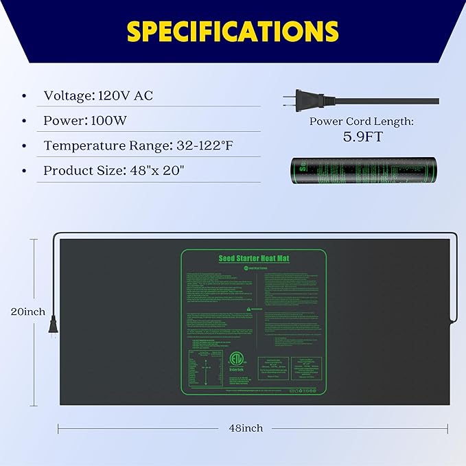 - Heating pad specifications: Size: 48*20 Inch; Wattage: 100W; Voltage: 120V; Material: PVC;Protect cold-sensitive plants and improve plant survival rate.