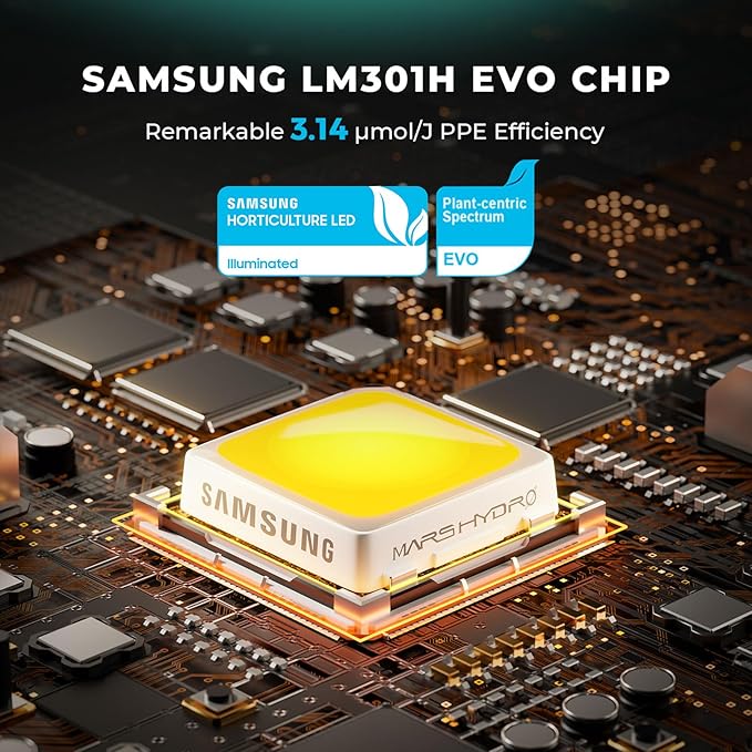 - 【150W HIGH YIELD SMART DIMMABLE GROW LIGHT】Packed with cutting-edge Samsung LM301H EVO diodes, delivering a remarkable 3.14 μmol/j per diode and provides an overall PPE of 2.85 μmol/j, a PPFD of up to 420 μmol/m²/s, making it an excellent choice for enhancing flowering to produce higher quality crops and greater yields.Sunlike full spectrum,0 to 100% light brightness adjustment,convenient for energy saving,suitable for all stages of plant growth.