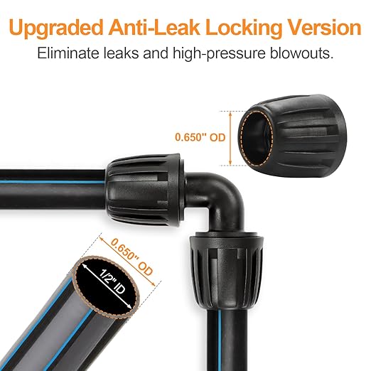 - 12 Pieces 1/2" Locked Barbed Elbow Fittings:The package comes with 12 pcs anti-leak locked elbow fittings for 1/2" drip tubing. This 1/2 in. barbed 90 degree elbow is designed to make a 90° turn in 1/2" micro tubing. Just make sure your tubing's outer diameter is under 0.650" OD to ensure compatibility. (Not suitable for generic 1/2" polytubing with a 0.600" Inner Diameter).