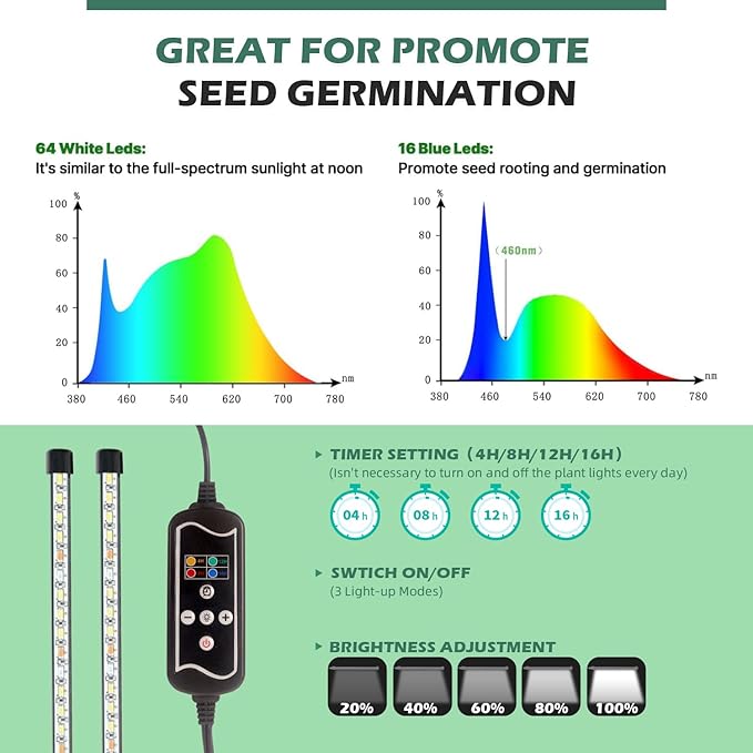 - Embedded Led Lamps:Each plant light is equipped with 4 blue and 16 white lamp beads, meticulously engineered to replicate natural sunlight. The blue light is tailored to boost the vigor of seedling root systems, leading to increased survival rates and the development of stronger, healthier seedlings. Experience seamless adjustment of light brightness and strip light settings, empowering you to cultivate microgreens, herbs, vegetables, fruits, and beyond with precision.