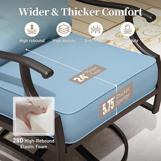 - LUXURIOUS 5.75" EXTRA THICKER CUSHION: This patio furniture set comes with a 5.75-inch extra thick soft cushion filled with 28D density sponge with high resilience for comfortable sitting. Enjoy a comfortable ride even if you use it for a long time, and say goodbye to the worries of collapsing seat cushions