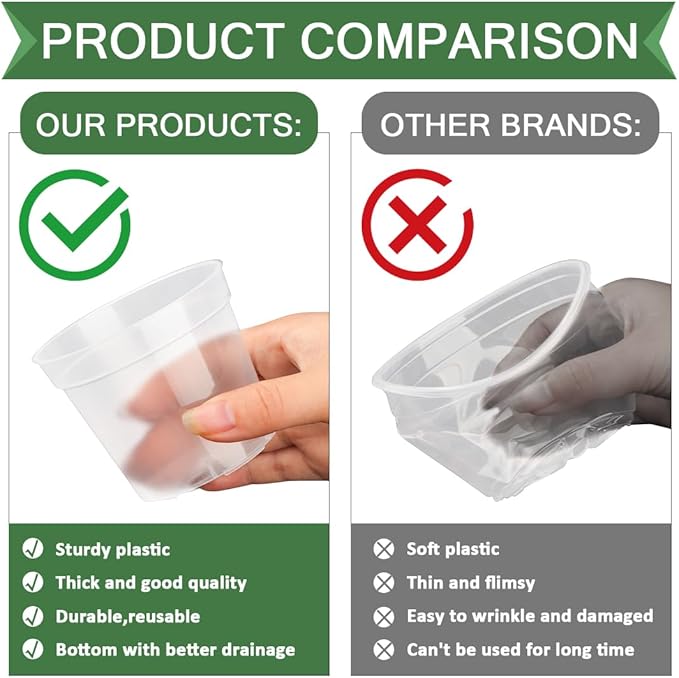- 【Clear Plastic】Clear transparent plastic pots to observe the seeds germination, roots growing every day. Made of fresh new plastic PP, no ordor or harm for plants growing, BPA free.