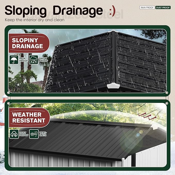 - Sturdy & Safe: The metal shed is made of galvanized steel with stronger tensile strength and hardness, and the structure of the shed is in accordance with the mechanics, which ensures the solidity and stability of the shed. In addition, we have optimized the safety of the shed. We provide plastic protection caps for each screw to prevent someone from being injured due to the exposed screws.