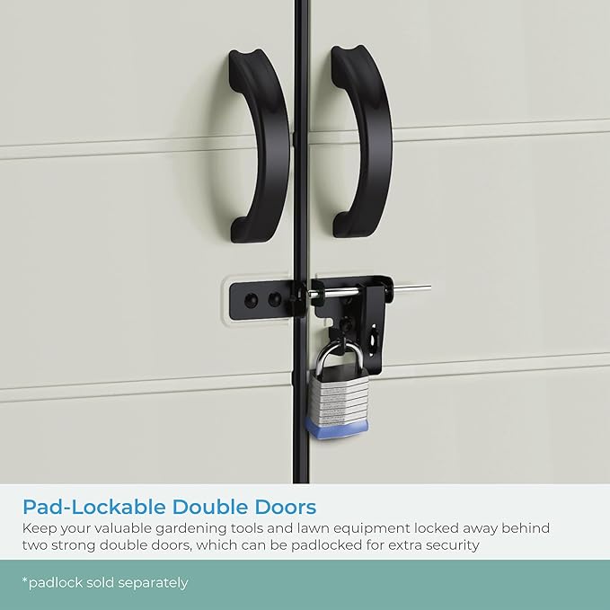 - PAD-LOCKABLE DOORS: Doors feature pad-lockable handles to prevent theft and unauthorized use (lock not included), and the upper and lower metal latches keep the doors closed and in place
