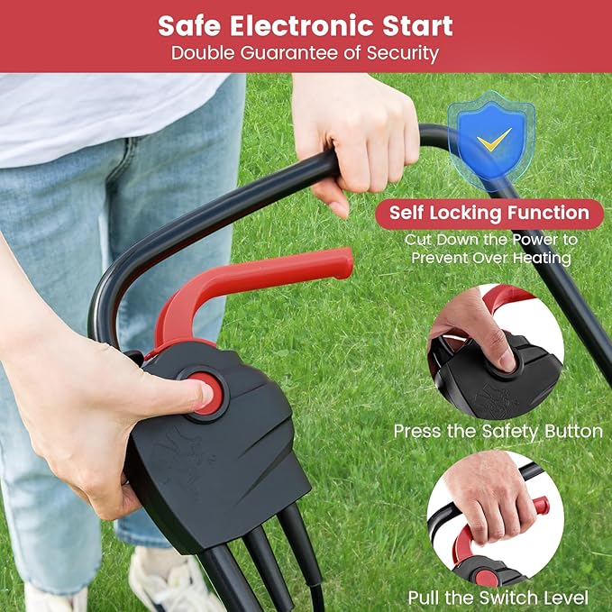 - Quick & Safe Operation: The electric lawn mower can be easily started by pressing double switches on the handle. Moreover, the double-switch design also ensures more safety, for the switch lever would automatically return to its off position after releasing. (Note: Do not work towards the cable.)