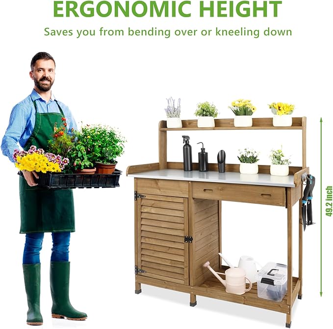 - Ample Storage Options: Equipped with a secure storage cabinet with a door latch, a large bottom shelf, and a sliding drawer, this potting bench provides ample space to store all your gardening essentials neatly.