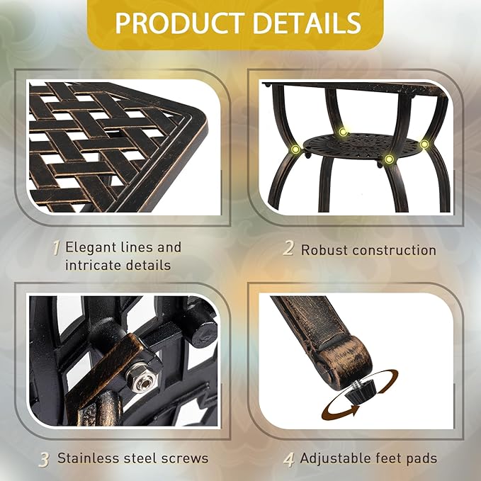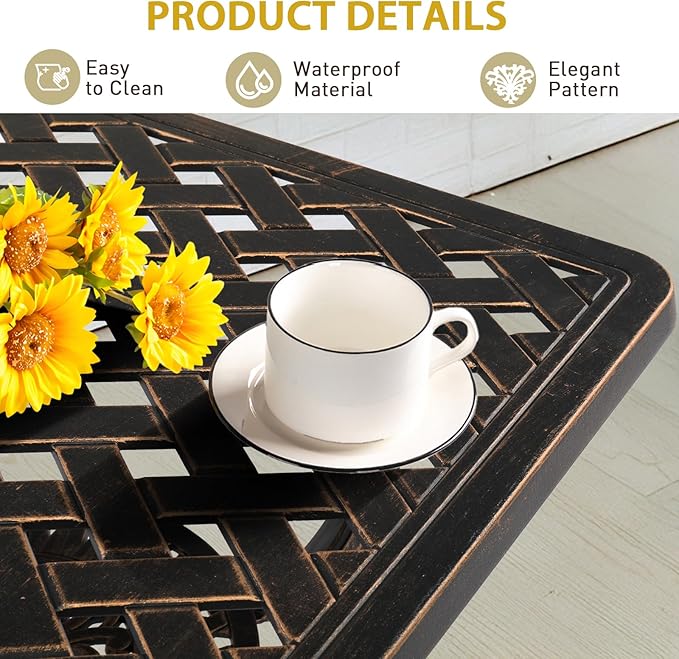 - PREMIUM CAST ALUMINUM: Crafted from high-quality cast aluminum, this square bistro table is built to withstand the elements. With exceptional durability, weather resistance and rust-proof features, it ensures long-lasting outdoor enjoyment with minimal maintenance required