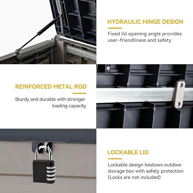 - Hydraulic Piston: The outdoor storage deck box features a hydraulic piston that can gently lift and close the top with minimal force to to prevent finger injuries; There are no user age restrictions