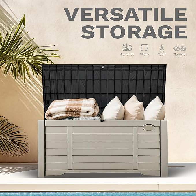 - Multi-functional Storage: The outdoor deck box's unique louvered wheel design complements your other patio furniture, making it ideal for storing outdoor cushions, pool accessories, and gardening tools