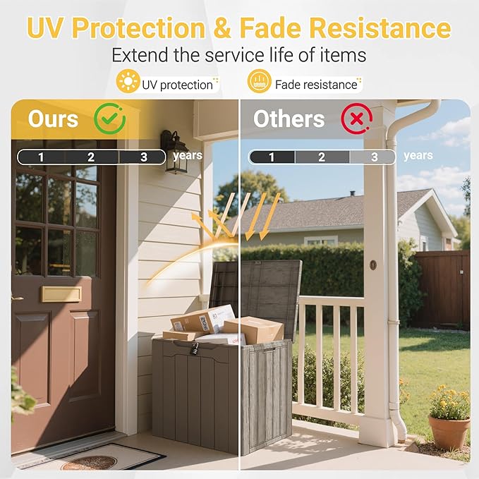 - Security design: Each deck box has lockable holes for added security. You can purchase the right lock for your needs; In addition, this box is equipped with hydraulic brackets to ensure your safety when opening and closing this box.