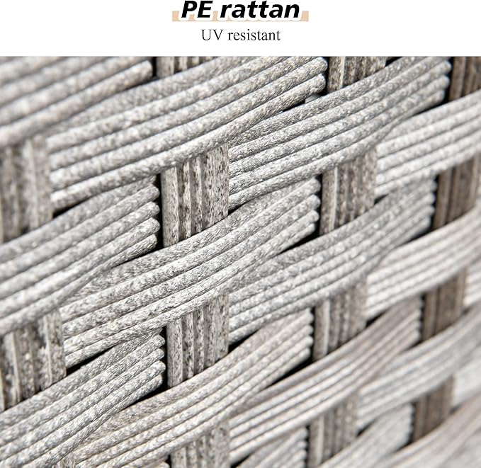 - Weather Resistance: PE strengthen wicker UV treated for long lasting. Cushions with yarn dyed woven cover features with UV-resistance, water drops/spilt resistance and good ventilation, resists water drops, coffee spilt. Unlike cheaply made thin print fabric, yarn dyed woven fabric got beautiful texture