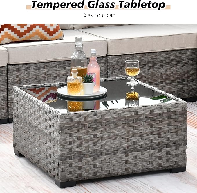 - Sectional Design: Comes with 1 firepit table,4 single arm chairs, 4 middle chairs, 2 corner chair and 2 tempered glass top coffee table. With chair connecting clips to lock the chairs together if need be. Modular design enables to make the patio set in any shape you like to fit your needs