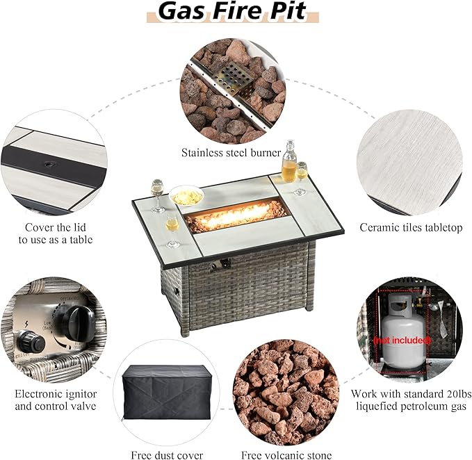 - FirePit Table Included: Comes with a square convertible propane gas fire pit table. Night time use it as a fire pit table to add atmosphere. Day time use it as a tall Dining table with the burner lid. Stainless Steel Burner withstands all weather. CSA certificated for safety.