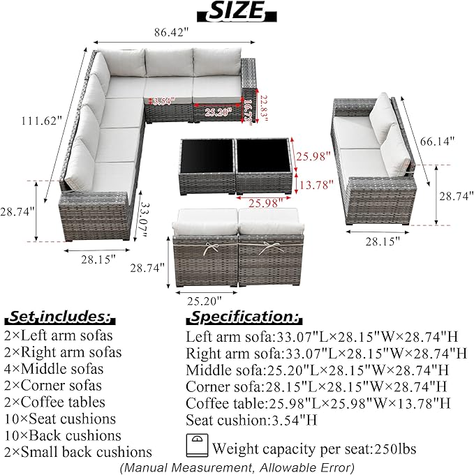 - Sectional Design: Comes with 4 single arm chairs, 4 middle chairs, 2 corner chair and 2 tempered glass top coffee table. With chair connecting clips to lock the chairs together if need be. Modular design enables to make the patio set in any shape you like to fit your needs