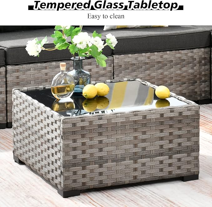 - Sectional Design: Comes with 1 firepit table,4 single arm chairs, 4 middle chairs, 2 corner chair and 2 tempered glass top coffee table. With chair connecting clips to lock the chairs together if need be. Modular design enables to make the patio set in any shape you like to fit your needs