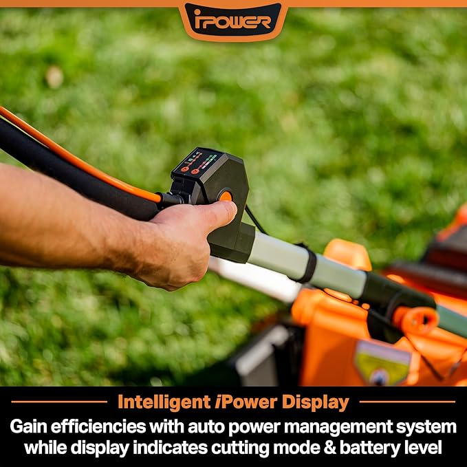 - iPOWER TECHNOLOGY DISPLAY: Save energy and gain efficiencies while mowing your lawn with this intelligent and automatic power management system. Display indicates the cutting mode and battery level.