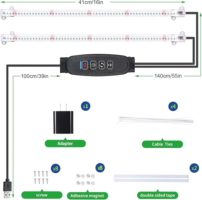 - 【Material Safety & Easy Installation】All aluminum material, strong corrosion resistance, hard to melt. The grow light pack comes with screws, ties, double-sided tapes and magnets to provide four mounting options. Compact design fits for various fixtures and surfaces. The power cord is 96 inches long for easy using in office,indoor,plant shelf,greenhouse etc.