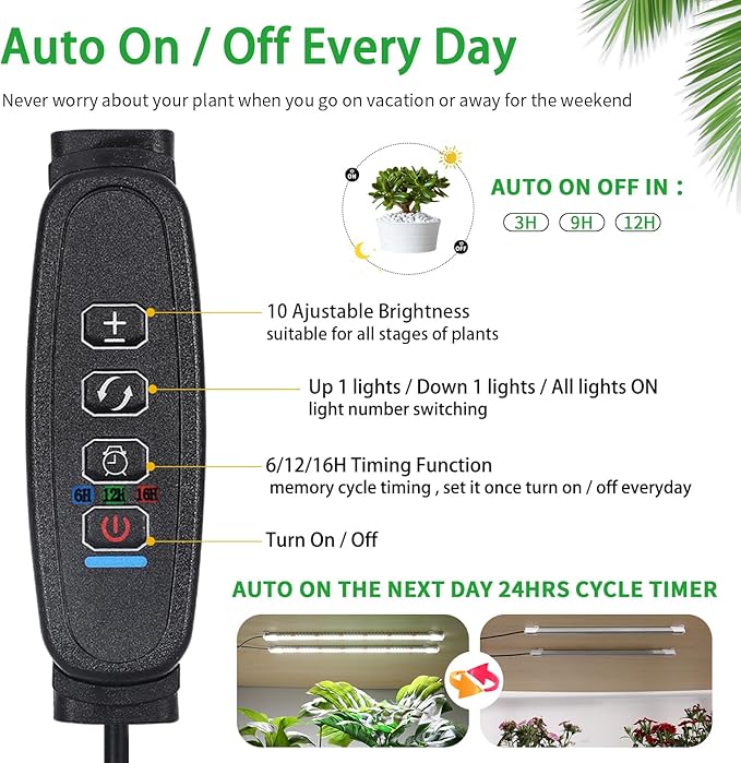 - 【Auto On/Off & Timing Function】The plant grow light comes with a cycle memory timer function, which can Auto turn on/off every day according to your settings: 6/12/16 hours, the grow light will Auto turn on and off at the same time the next day, no manual operation is required, it can take care of your plants when you on work or vacation.