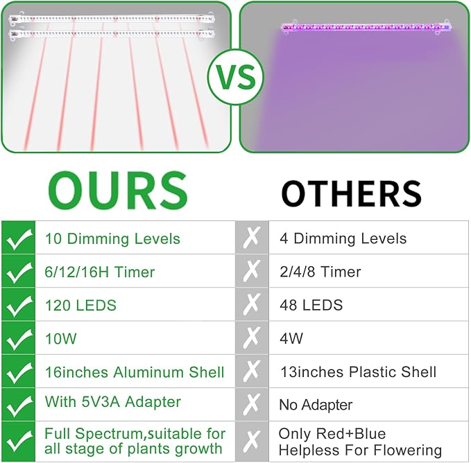 16‘’ LED Grow Light Strips for Indoor Plants,Full Spectrum 120 LEDs with 4 Install Methods, 6/12/16H Timer, 10 Dimmable Levels, 3 Switch Modes for Seedling Succulent Sunlike Strip (2 Head 1 Pack)