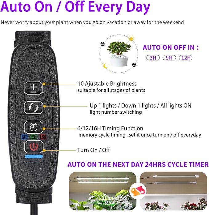 - 【Auto On/Off & Timing Function】The plant grow light comes with a cycle memory timer function, which can Auto turn on/off every day according to your settings: 6/12/16 hours, the grow light will Auto turn on and off at the same time the next day, no manual operation is required, it can take care of your plants when you on work or vacation.