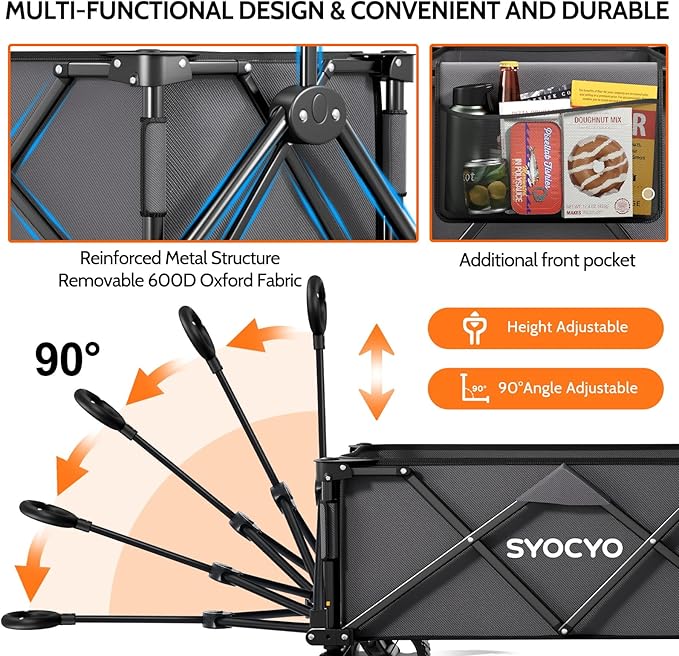 - Adjustable Handle: SYOCYO wagon really did it! Our folding wagon has a smoothly rotating,90° adjustable handle for making the wagon super easy to pull, turn and maneuver, fits people of different sizes comfortably. The handle locks securely in place, which can effectively control the direction of the folding wagon.Flexible handle could achieve the rebound function and keep it upright. You don't have to bend over to reach the handle
