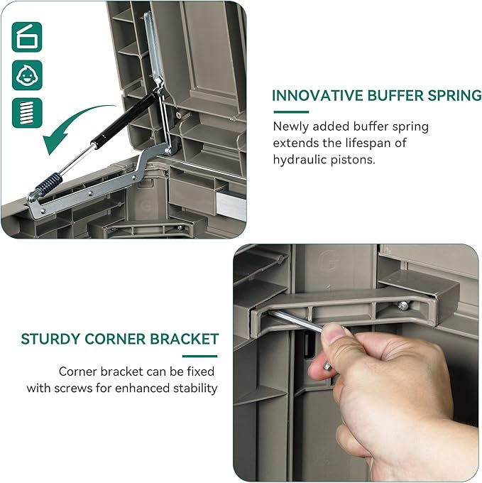 - INNOVATIVE HYDRAULIC PISTONS- newly added buffer spring prolongs hydraulic pistons’ life span; Easy lift and soft close mechanism allows the top to completely open and shut slowly with minimal effort - easy for people to use and prevents smashed fingers.