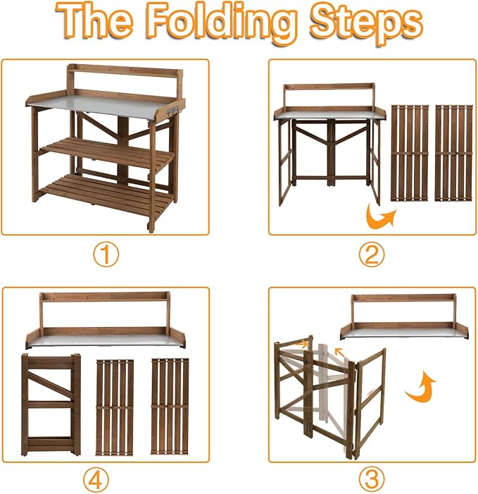 - 【Foldable and Portable】The foldable and portable garden workstation can provide a lot of convenient when you are assembling. When you take it apart, you will get a table top, a bottom frame and two wooden shelves. When you want to change the scene of use, the foldable outdoor wood workstation table will provide you with great convenience.