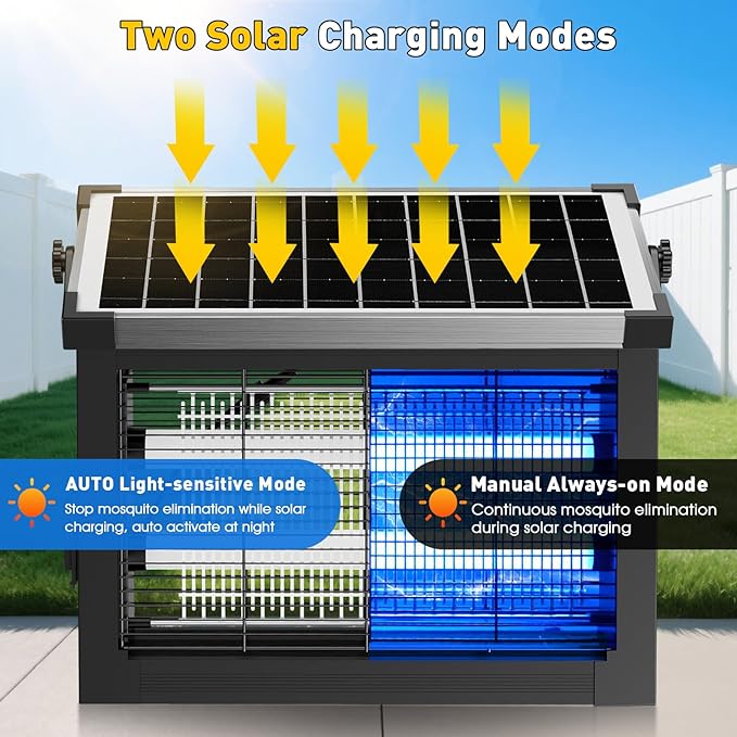 - AUTO Light-sensitive Mode and Manual Always-on Mode: The bug light zapper has two mosquito killer modes. The Light-sensitive mode stops eliminate mosquitoes during the day when solar charging and automatically activates at night when solar charging stops. The Always-on Mode continues to eliminate mosquitoes while solar charging, meeting your various needs. (To extend battery life, Light-sensitive Mode is recommended.)
