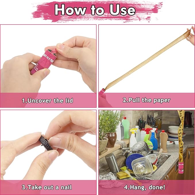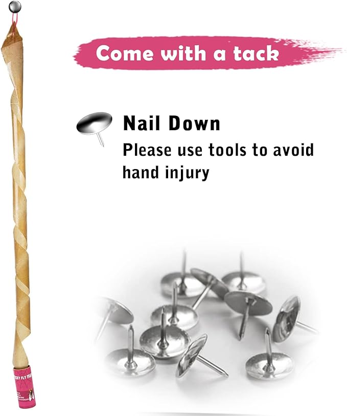 - Notice: when the weather gets hot, the gel of the fly strips melts, the pink hanging string can be easily pulled off. We suggest you prepare a rope and a pair of scissors, when a small amount of sticky paper is pulled out, poke a hole in the paper with a pair of scissors and tie your rope, at last, pull the rest out cord slowly while turning tune in a counterclockwise motion. Or nail the sticky fly paper directly to the wall. It's easier to refrigerate for a while before using it!