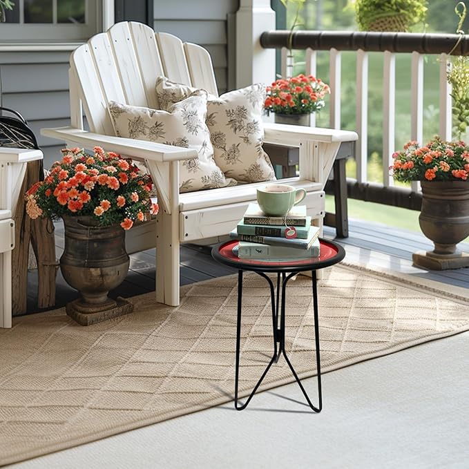 LIFFY Outdoor Side Tables, 12" Coffee Table Small Patio Table, Indoor Small Round Home Decorative End Table, Plant Stands Table Outside, for Yard Balcony Garden Bedside Pool Beach(Metal & Glass,Red)