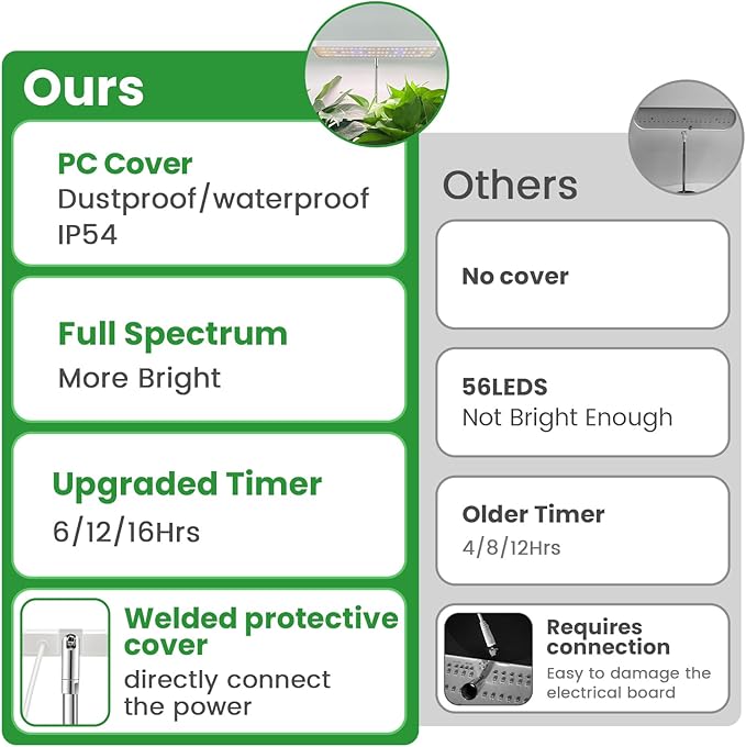 - Upgraded Plant Grow Light: This plant lamp is equipped with PC cover, and a protective sleeve is welded to the lamp board interface. Not only is it waterproof, it also provides safe lighting protection.5.2 in metal base and anti slip pads ensure stability.