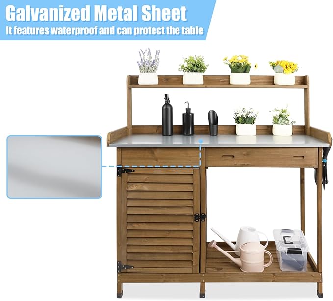 - 【Thoughtful Details】The top shelf of the work table can house your planted flowers and tools. The raised tabletop edges can prevent the falling of items on the top. The drawer, lower slatted shelf, storage cabinet and top shelf of the planting table make you store a variety of tools more easily. 3 side hooks are perfect for keeping your favorite trowel, trencher or other tools in arm's reach.