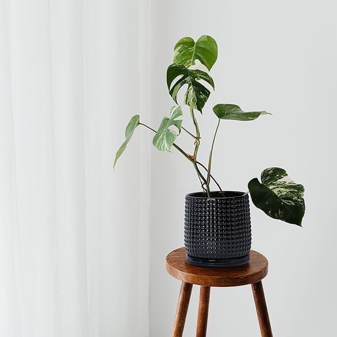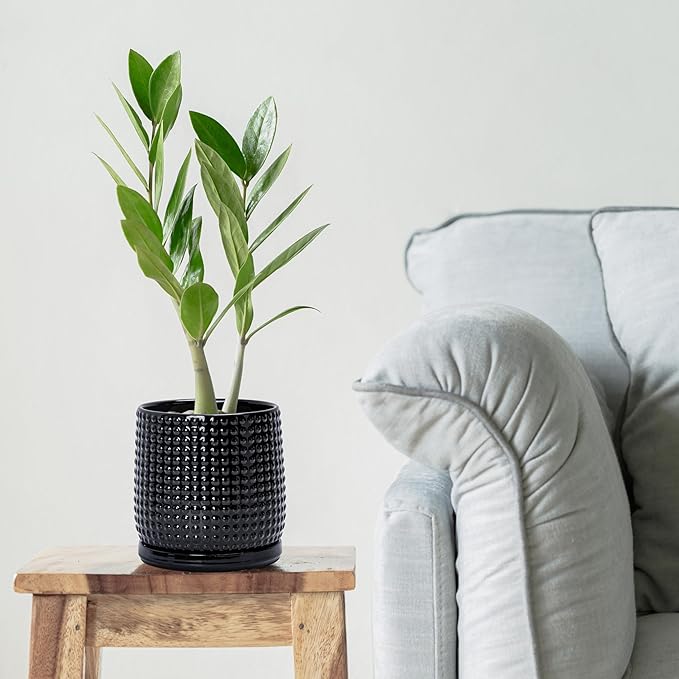 D'vine Dev 6 Inch Ceramic Beaded Stoneware Planter Pot - Flower Pot with Drainage Holes and Saucers for Indoor Succulent Plants or Flowers, Glossy Black, 27-C-X-2