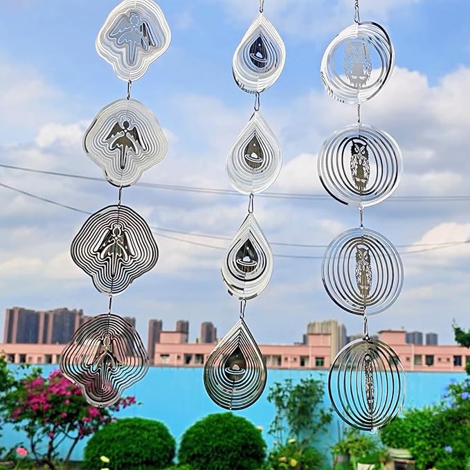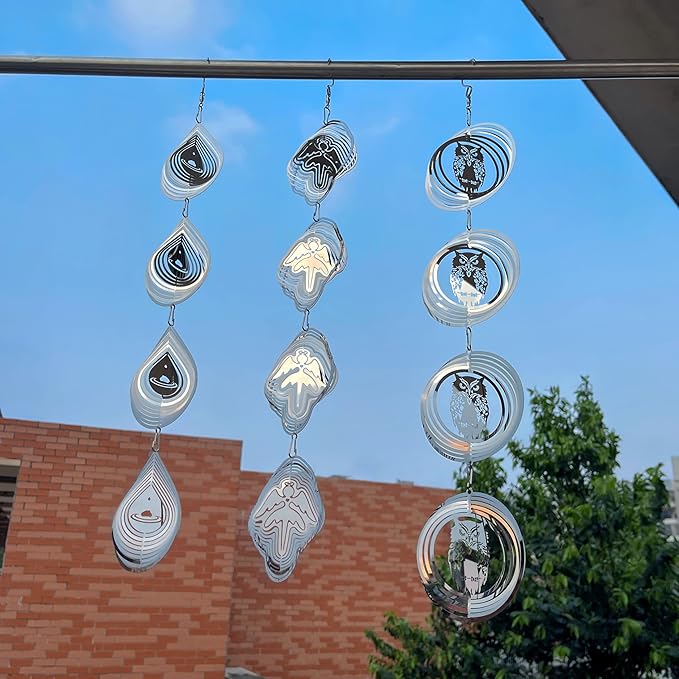 - These are made up of 3 strings of different shapes, there is a string of teardrops, a string of angels and a string of owls! These wind spinners are extremely reflective and can be easily rotated. Reflects bright light to scare away birds.