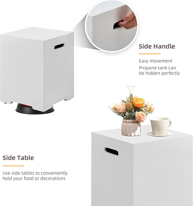 - Propane Tank Cover & 2-in-1 Fire Pit Table: This stylish, functional smokeless propane fire pit table has a storage tank (preserving aesthetics, The propane tank can be hidden perfectly). Both the table and tank holder double as side tables for drinks/food. With the lid closed, it’s a spacious coffee table; open, it offers cozy warmth as a concrete fire pit